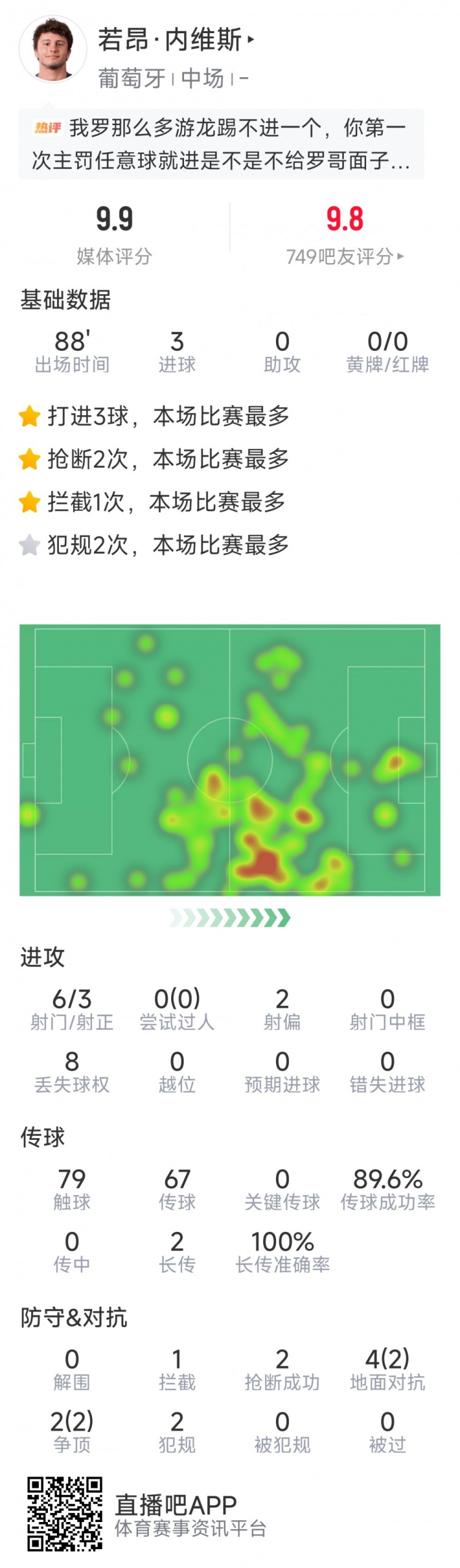若昂·内维斯本场数据:上演帽子戏法,6射3正,2次抢断